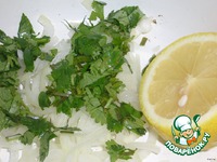 Лук порезать полукольцами, добавить порезаную зелень, сбрызнуть лимонным соком, слегка помять и дать помариноваться 3-4 минуты. |