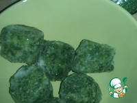 Шпинат (у меня замороженный из пакета) нарезать кубиками и добавить в сковороду. Посолить, поперчить по вкусу. Не забываем перемешивать. |