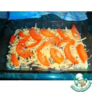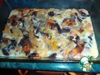 В огнеупорную посуду выкладываем продукты в следущем порядке - тертый картофель, подготовленный фарш, сверху обжаренный лук с грибами. Заливаем все это нашими сливками |