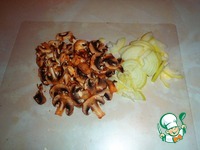 Шампиньоны нарезаем тонкими ломтиками, а лук - четвертькольцами, слегка обжариваем вместе |