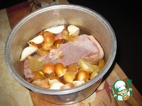 Затем добавить перец, лавр. лист, соль ( можно побольше- (слегка пересолить) т. к. мясо возьмет сколько надо). Бульон будет горьковатым - не пугайтесь -это от шелухи. Варить еще 30-40 мин. |