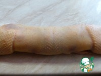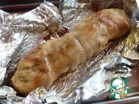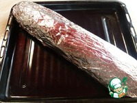 По истечении двух часов достаем рулет, перекладываем на другой противень, разрываем фольгу и запекаем 35 минут при 180 градусах для образования хрустящей корочки. |