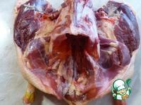 Когда цель достигнута и гусь полностью обескостен, срезаем с каждой грудки гуся понемногу мяса и равномерно распределяем по всей коже, это делается для того, чтоб рулет получился ровным и красивым. |