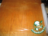 На плёнку раскладываем фарш слоем примерно 1,5-2см. Пласт фарша формуем в виде прямоугольника. |