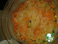 Сливаем воду с фунчозы и промываем под холодной водой. Выкладываем фунчозу в салатник, добавляем огурцы, перец, обжареный лук, корейскую морковь. |
