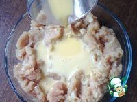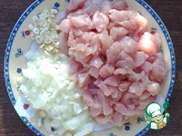 Куриное филе нарезаю кубиками со стороной примерно 1,0-1,5 см Лук и чеснок мелко рублю Куриное филе, лук и чеснок измельчаю в измельчителе |