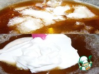 Растворяем в карамели набухший желатин, вводим сметану, тщательно размешиваем смесь. |