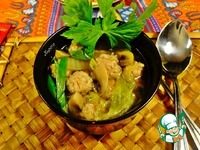 Украсить суп крупно порезанным зелёным луком и веточками зелени сельдерея. |