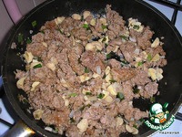 Перемешиваем с фаршем и тушим дальше. Кладем мелко нарезанную зелень. Солим и приправляем специями. Когда будет полностью готов, даем остыть. |