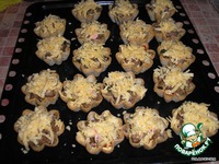 Теперь выстраиваем тарталетки на противне и в каждую кладем чуточку майонеза на дно |