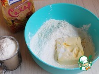 Смешаем 150гр муки, стакан крахмала, разрыхлитель. Добавляем мягкое масло (маргарин). Все хорошо перемешаем руками в крошку. |