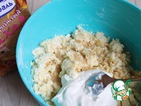 Добавляем 2 ст. л. сахара и сметану и остальную муку. |
