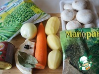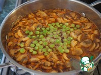 Всыпать горошек. Довести до кипения и варить около 5-7 минут. Добавить в кастрюлю мясо, прогреть в течение 1-2 минут и снять. |
