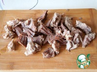 Готовое мясо вынуть из бульона и дать немного остыть. Нарезать на небольшие кусочки. |