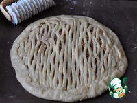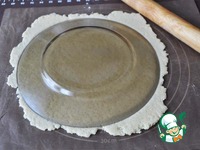 Достаём их холодильника больший шарик теста, раскатываем для удобства на пекарской бумаге круг толщиной около 7 мм. Если тесто липнет, присыпьте мукою. Прикладываем тарелку и вырезаем круг. |