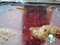 Готовим желе - примерно 1 литр воды - в зависимости от количества мяса и глубины формы. Разводим джем - малиновый, добавляем по способу, указанному производителем, желатин. Джем - от «Махеевъ». |