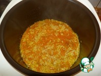 Теперь добавляю натертую морковь. И пассерую овощи дальше (до сигнала). Крышка при этом продолжает быть открытой. |
