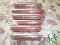 Выкладывая массу на пищевую пленку, свернуть колбаски. Края закрепить проволкой. Можно ниткой, но я от нее отказалась из-за того, что она сползает. |