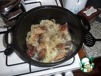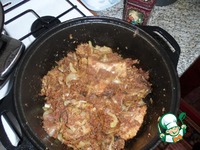 Вернуть все мясо в казан, добавить лук и тушить все до размягчения лука. |