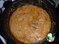 Вот так выглядит наш вулкан. В книге сделан особый акцент на том, что бульон добавляется после. Я думаю, что это для раскрытия аромата специй. |