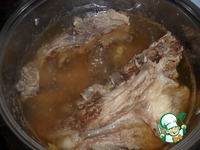Мясо готово. Бульон сцедить в миску, мясо выложить на тарелку. |