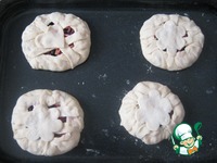 Края теста подвернуть к центру и защипнуть. Сверху положить полоски теста крест-накрест и небольшой кружочек теста (я вырезала формочкой цветочек). |