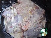 Моем куриные части, выкладываем в чашу мультиварки. Перчим, солим, добавляем сметану, если сметана не жирная, можно добавить сливочное масло, оно придаст курице особую нежность. Перемешиваем. |