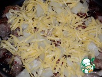 Мясо выложить в форму. Добавить коньяк, ананасы. Посыпать натертым сыром. |