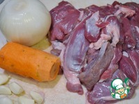 Подготовим необходимые ингредиенты. Мясо нарежем достаточно крупно, лук, чеснок и морковь почистим. |