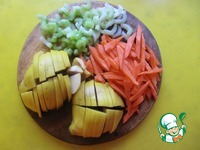 Сельдерей очистить с внешней стороны, нарезать на кусочки, айву очистить от грубой сердцевины, нарезать пластинками, морковь нарезать наискосок крупной соломкой. |