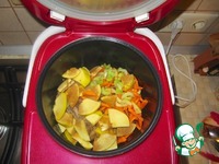 Включить на мультиварке программу "Поджаривание", налить в чашу растительное масло, положить мясо и обжарить с двух сторон до румяной корочки. |