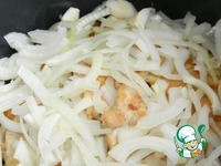Включить мультиварку, режим "поджаривание". Налить масло. Поджарить мясо с двух сторон. Делаем это для того, чтобы сок задержался в мясе. Можно и пропустить этот шаг. |