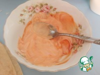 Затем смешала майонез и кетчуп томатный, получился вот такой вкусный соус. Теперь, когда курочка немного остыла и не обжигает пальцы, ее нужно нарезать поменьше. |