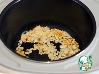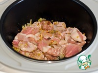 Добавить свинину к луку, обжаривать до окончания программы "Жарка", не забывая периодически помешивать мясо. |