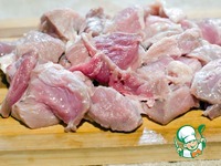 Пока лук обжаривается, нарезать свинину на кусочки. |