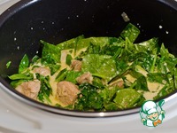 После того, как мясо протушилось 30 минут, добавить в него шпинат и жирные сливки, перемешать и готовить до окончания программы. |