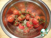 Черри кладу в миску, поливаю оставшимся оливковым маслом, чуть солю, посыпаю орегано, аккуратно перемешиваю. |