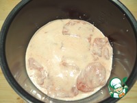 В чашу мультиварки выкладываю куриное филе, выливаю йогуртовый маринад. |