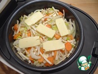 В чашу мультиварки вливаю воду, а на овощи кладу кусочки сливочного масла. Крышку мультиварки закрываю и включаю режим "Тушение". |