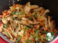 Кладем в чашу нарезанную грудку и лук, перемешиваем. Ставим режим "Поджаривание" 10 минут. |