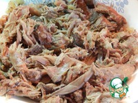 После указанного времени достаем мясо, отделяем его от костей, удаляем лавровый лист и травяные веточки. |
