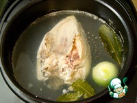 Приготовим бульон. Куриную грудку отварить в подсоленной воде с луковицей и лавровым листом. Режим "Суп" - 1 час. |