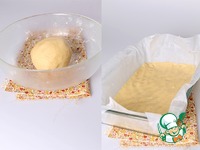 ... и замесим тесто. Возьмем форму (у меня 13х22), застелем пекарской бумагой, аккуратно выложим тесто и отправим форму в холодильник на 30 минут. А в это время разогреем духовку до 180 градусов. |