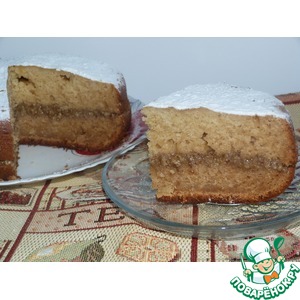 На промазанный корж кладем "верхушку" и украшаем кому как нравится. Самое простое - сахарная пудра. (Хорошо подойдет лимонная глазурь, но сегодня мне некогда было заниматься глазурью.) |