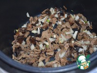 Грибы с луком немного спассеровать на растительном масле в чаше мультиварки на режиме "Поджаривание" |