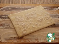 Слоеное бездрожжевое тесто раскатываем на поверхности посыпанной смесью муки 3 ст. л. и 3 ст. л. сахарной пудры. Тонким слоем 1-1.5 мм |