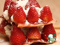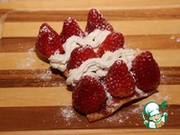Приступаем к оформлению мильфея. На корж выкладываем клубнику, между клубникой с помощью кулинарного шприца прокладываем взбитые сливки. Присыпаем сахарной пудрой. |