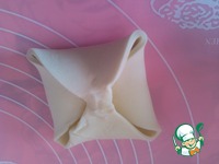 Тесто раскатать, разрезать на квадраты (примерно 11х11 см или 12х12 см). В центр положить крем. Свернуть квадраты конвертом. Можно, как я, смазать верх желтком. |