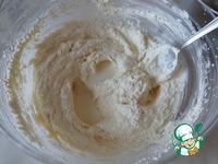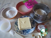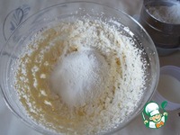 Масло взбить с ванильным и обычным сахаром, солью и яйцами. Крахмал просеять с мукой и содой. |