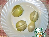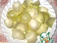 Лук почистить и разделить на такие кусочки, чтобы удобно было надевать на шампуры. |